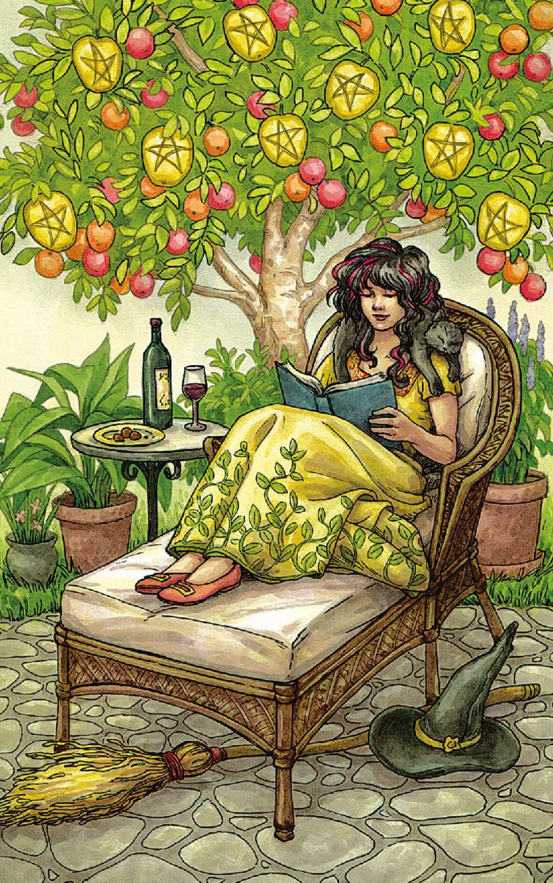 For this spell, I like to use the Nine of Pentacles card in Deborah Blake's Everyday Witch Tarot. Elisabeth Alba's painting features a woman reading in a comfortable chair under a tree abundant with apples and pentacles, wine, and nibbles on a table beside her, happy and fulfilled in herself. To perform this spell, block off several hours for yourself, and nest in your favorite chair, a sofa, or your bed. Have a book, a beverage, a snack, a pet, and your journal handy. Take the card and soak in the beauty of the figure, enjoying her bountiful, beautiful life. Imagine yourself as the figure in the card. Ponder the wonderful things in your life and give thanks for them. Spend some time enjoying yourself, reading and writing in your journal about what you love about your life. Rest and do whatever you want to honor yourself and your good fortune. Keep the Nine of Pentacles card where you will see it every day for nine days. Each time you see the card, it will revive the sense of wellbeing. |